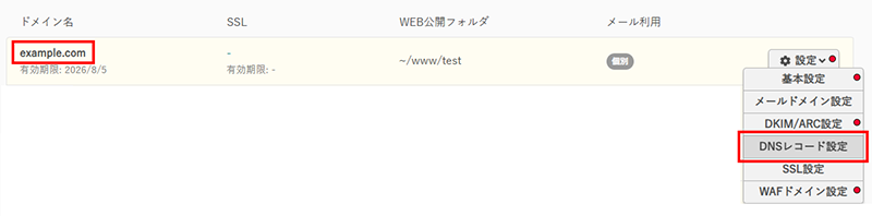 以下手順の通り、example.comのDNSレコードを編集してください。