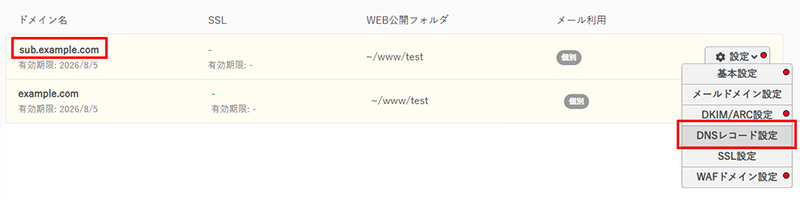 以下手順の通り、該当のサブドメイン(この例ではsub.example.com)のDNSレコードを編集してください。