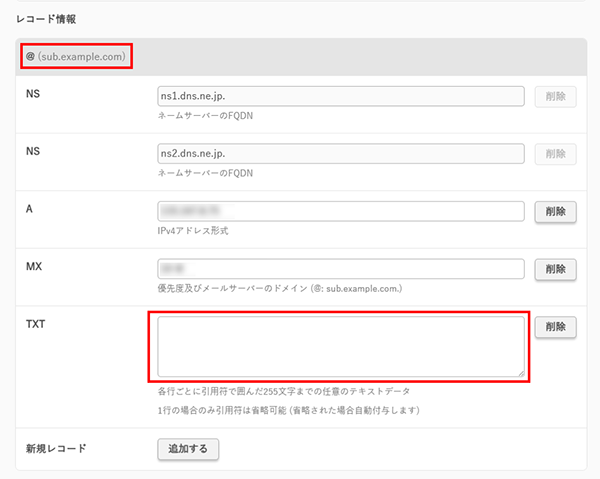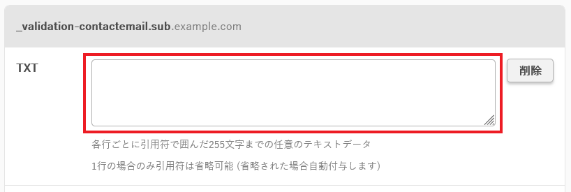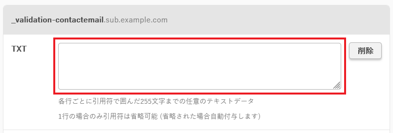 例:_validation-contactemail.sub.example.com. 3600 IN TXT "お客様メールアドレス"