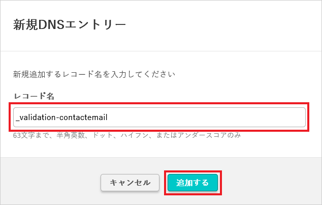 5新規DNSエントリーのレコード名「_validation-contactemail」を入力し、『追加する』をクリックします。
