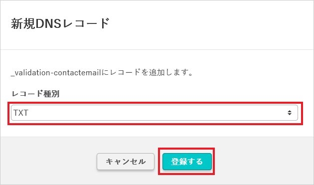 6新規DNSエントリーのレコード種別「TXT」を選択し、『登録する』をクリックします。