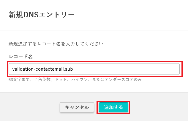 レコード名に「_validation-contactemail.sub」を入力し、「追加する」をクリックします。